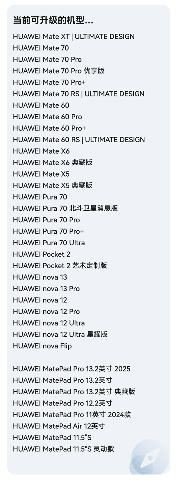 同时,华为Mate 70系列、华为Mate X6系列等多款机型均已开启HarmonyOS 5.1升级,即日起开始报名。
