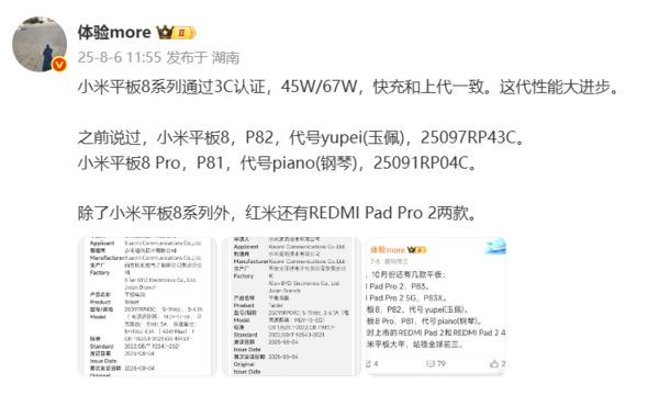 CNMO注意到,上述博主此前称,小米平板8系列已正式通过入网认证。其中,小米平板8,代号yupei(玉佩),型号为25097RP43C,支持45W快充;小米平板8 Pro,代号piano(钢琴),型号为25091RP04C,充电功率为67W。另外,REDMI Pad 2 Pro将提供两款机型。