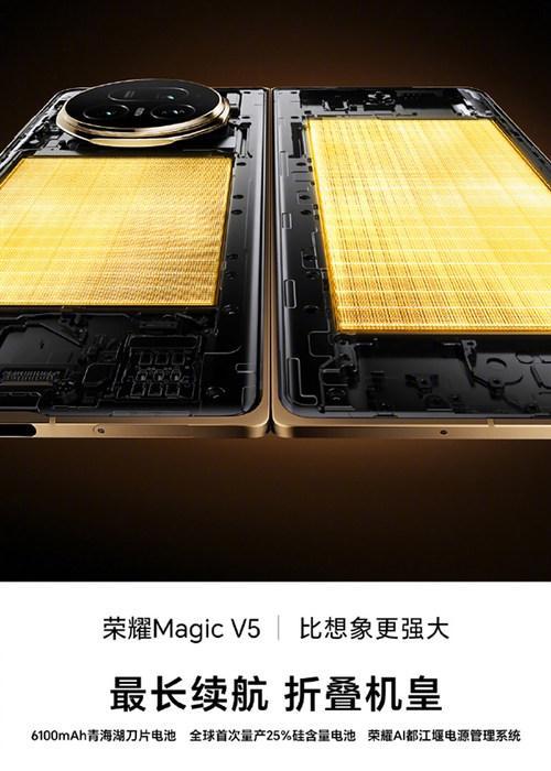 而在电池方面,荣耀Magic V5更是在折叠厚度仅8.8mm的机身内,搭载了业内领先的6100mAh青海湖刀片电池,做到了25%硅含量,并且还是全球首次量产。6100mAh的电池容量即便是放在今年新一批直屏旗舰手机中也属于顶级,配合AI智能电源管理系统,续航能力堪称一绝,无论是大屏幕、高刷新率,还是日常重度使用,都能应对自如。