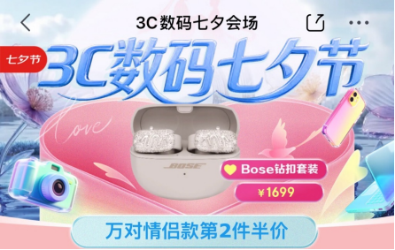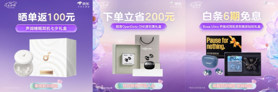 声阔睡眠耳机带来七夕礼盒,其中SleepA30耳机三重降噪应对人声、电视声等噪音,AI脑波疗愈,科学引导深度睡眠,到手价1319元,晒单返100元。韶音OpenDots ONE耳夹耳机礼盒中,耳机产品采用动钛弧设计,IP54防尘防水,40小时续航支持无线充电,杜比音效带来清晰聆听,8月25日至31日,下单立省200元。Bose Ultra开放式耳机京东限定钻扣礼盒,内含Bose Ultra开放式耳机一对及京东限定钻扣一对,耳机沉浸空间音频技术实现“戴耳机也能听到你”的效果,1689元享6期免息。