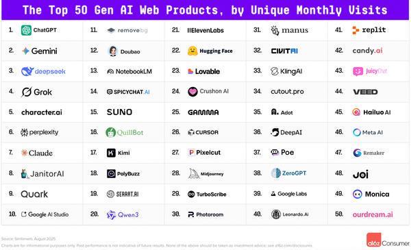近日,全球知名风险投资公司Andreessen Horowitz(简称a16z)发布全球Top100消费级生成式AI应用榜单。榜单分为Top50生成式AI网页端产品和TOP50生成式AI移动端应用。ChatGPT在网页端及移动端均领先,谷歌旗下Gemini紧随其后。