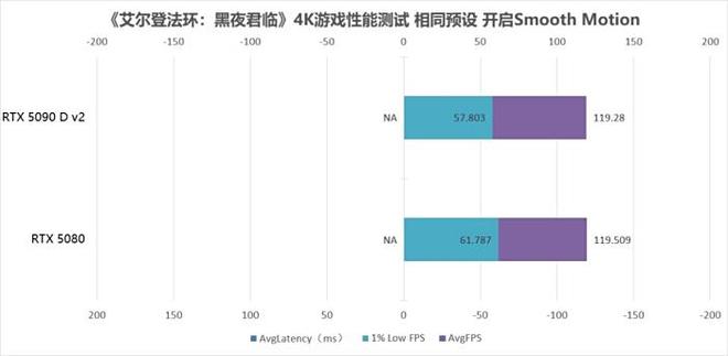 可以看到,Smooth Motion带来的帧数翻倍效果确实存在,且能被FrameView软件记录,但锁帧的效果也是实实在在的,RTX 5090 D v2与RTX 5080都被牢牢锁在120帧。更奇葩的是,即使显卡在游戏中几乎“没使上力”,游戏的1% Low帧表现也难以令人满意,实际游戏中的画面观感与操作体感也难称流畅。