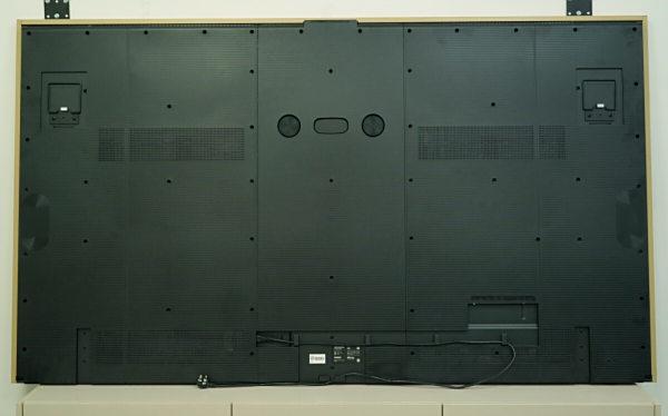 再来看背后,没有凸起的小书包,纯平背板的设计更显得纤薄平整,实现真正的无缝贴墙。背面中间还有个重低音单元,顶部左右则是两处天空声道,总共包含11个高品质声学单元,支持7.1.2物理声道,峰值功率高达243W。