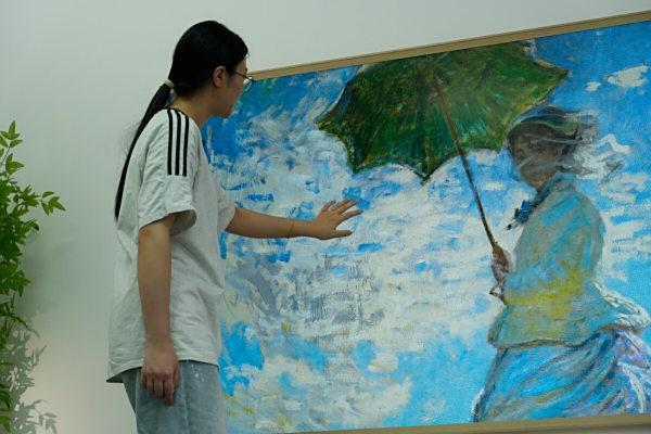 首先是世界名画的测试样张,以《撑伞的女人》油画为例,可以看到其笔触细节、色彩层次和艺术肌理还原都非常优秀,放大画面后,比如这些颜料堆叠、衣物纹理,每一道笔锋都清晰可辨,色彩过渡也十分自然。