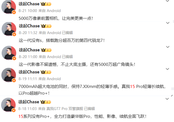 此前,真我副总裁徐起曾透露,真我15系列将取消Pro+版本,集中资源打造更强大的Pro版,实现性能、影像与续航的全面升级。真我15 Pro将搭载跑分超百万的第四代骁龙7移动平台,内置7000mAh大电池,同时保持约7mm的轻薄机身,兼顾长续航与便携性。影像上,有大底主摄和5000万像素超广角镜头,前置为5000万像素镜头。