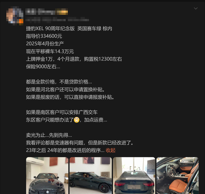但没想到的是,今天看到有车商发的内容,捷豹XEL 90周年纪念版,居然已经直接干到裸车14.3万了......