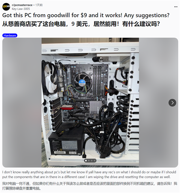 9月7日消息,最近,一位电脑新手在论坛上分享了自己在当地的Goodwill二手店淘到的主机,以令人难以置信的9美元(约64元人民币)买到了一台二手电脑。