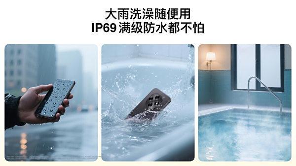 OPPO A6 Pro延续行业最强的IP69/IP68/IP66防水认证,通过九大防水结构设计,对显示屏、电池盖、摄像头等关键部件进行系统性密闭防护,可从容应对日常泼溅、深水浸泡、高压喷水甚至高温热水冲刷等场景。更实用的是,OPPO A6 Pro支持扬声器自动排水、湿手、油手触控及水下拍照功能,雨天通勤或厨房操作时无需担心设备受损。