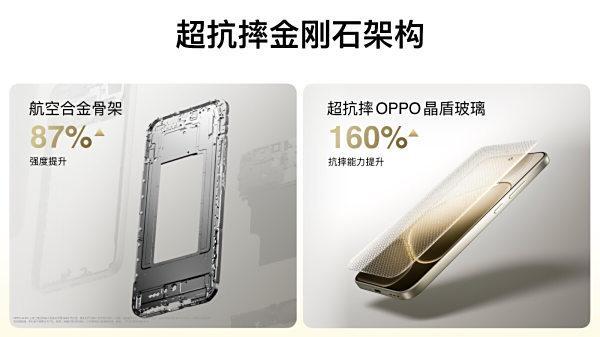 抗摔能力上,OPPO A6 Pro 采用 “超抗摔金刚石架构”,机身配备金刚四角防撞梁中框、高强度航空合金骨架与 OPPO 晶盾玻璃,内部关键区域加入“安全气囊”式泡棉缓冲层,使其通过高温、极低温等 7 项军标环境测试,日常跌落磕碰无需担忧,真正做到“横竖里外都抗摔”。