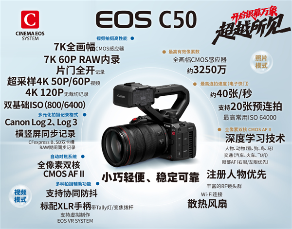 佳能发布EOS C50 7K全画幅数字电影摄影机,支持片门全开功能