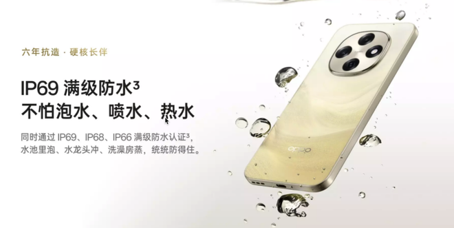 既然是主打耐用属性的手机,在关键的耐摔防水方面,这款手机均做到了满级的的配置,OPPO A6 Pro 达到了 IP66、IP68 与 IP69 “满级防水”标准,支持热水冲洗、喷射水流的高强度考验。机身采用 超抗摔金刚石架构,由 AM04 航空级铝合金中框、晶盾玻璃、缓冲泡棉等组成结构防护层,经军规跌落与冲击实验验证,提升整体抗摔耐用性。
