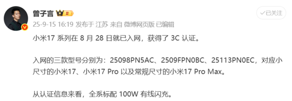 值得一提的是,小米集团总裁卢伟冰此前已在社交平台宣布,本月将发布全新小米17系列,包括三款产品:小米17、小米17 Pro和小米17 Pro Max。小米17系列全系将全球首发第五代骁龙8至尊版移动平台。多方消息此前透露,小米17系列发布会定档9月25日。