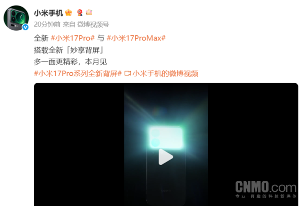 9月16日,CNMO注意到,小米手机官方宣布,小米17 Pro与小米17 Pro Max搭载全新妙享背屏,将于本月亮相。