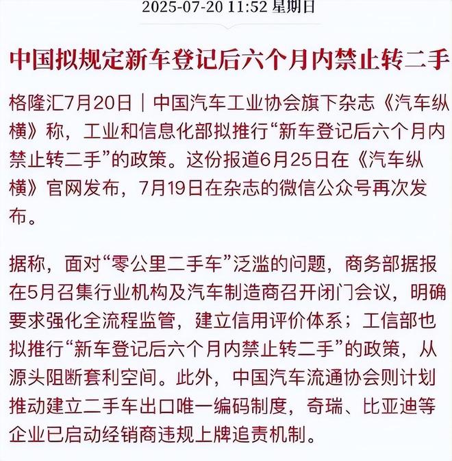 7月,中国汽车工业协会释放关键信号:工信部拟推出“新车登记后6个月内禁止转为二手车”的政策。矛头直指零公里二手车灰色产业链。这一政策旨在从源头遏制“零公里二手车”乱象,防止套利行为。