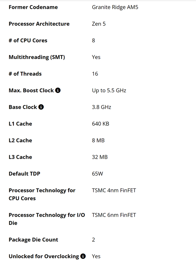 锐龙7 9700F基于代号“Granite Ridge”的Zen 5架构打造,实质上是锐龙7 9700X的无核显版本。其主要规格与9700X基本一致:具备8核心16线程,基准频率为3.8GHz,最高加速频率可达5.5GHz。缓存配置包括640KB L1缓存、8MB L2缓存和32MB L3缓存,热设计功耗(TDP)为65W。
