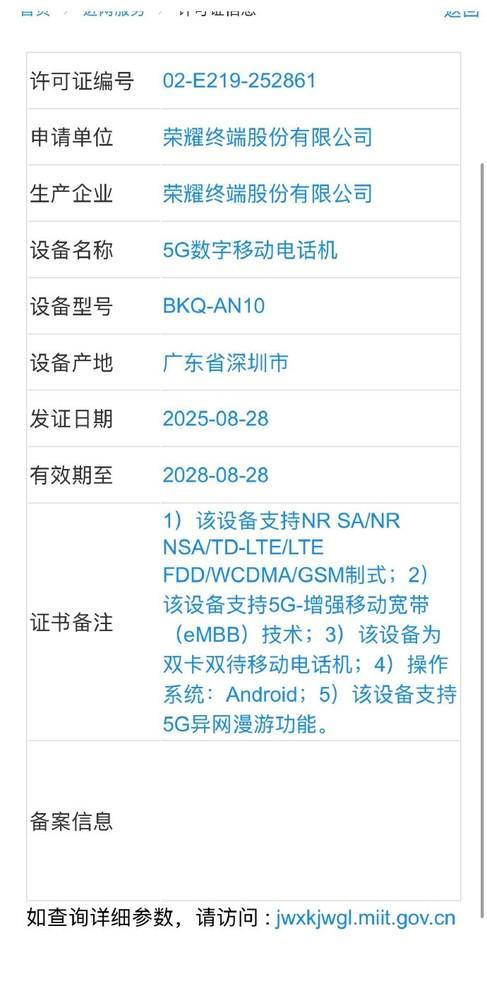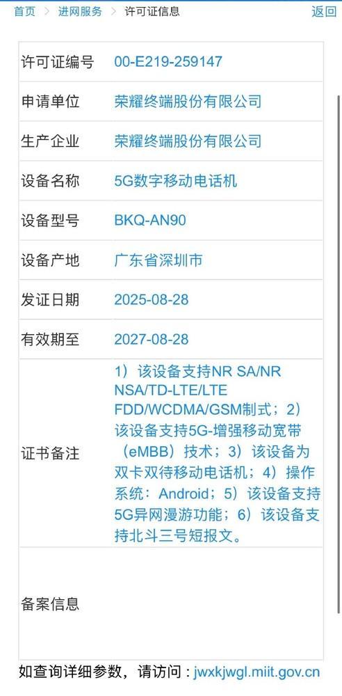 近日,荣耀新款旗舰手机Magic8 Pro双型号入网,设备型号分别是BKQ-AN90和BKQ-AN10。认证中显示,型号为BKQ-AN90的机型为“双卡双待移动电话机”,支持北斗短报文。