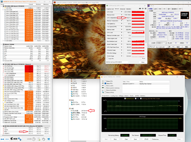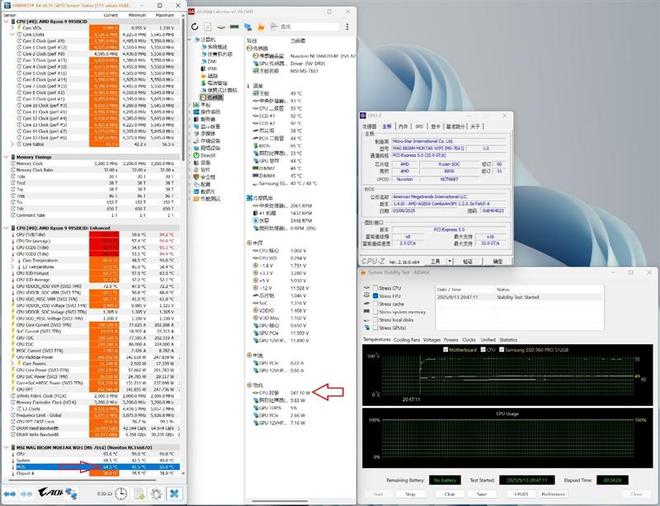 可以看到即便是长时间双烤,GPU的热量也并未影响到锐龙9 9950X3D的功耗表现,依旧保持247W的性能释放。