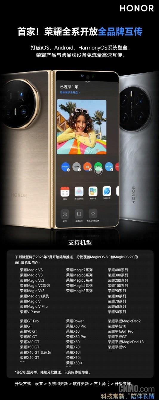 据CNMO了解,荣耀宣布重大升级——全系开放全品牌互传,成为首家实现iOS/Android/HarmonyOS全品牌互传的厂商。用户可通过荣耀设备与任意品牌手机免流量高速互传文件,包括荣耀Magic V5、荣耀Magic 7等在内的80余款机型支持全品牌互传,分享图片、视频、文件等。