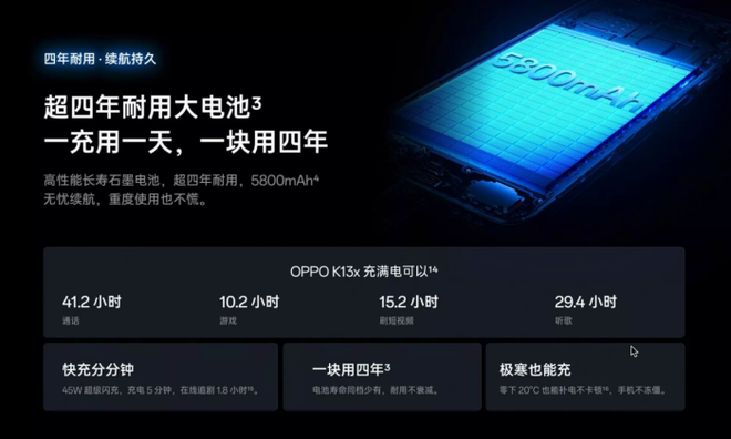 在续航方面,OPPO K13s内置 7000mAh 六年耐用大电池,配合 80W 超级闪充,带来极强的续航和回血能力。同时,在外观配色方面,OPPO K13s 提供聚能蓝与超能白两款配色,整体在性能、续航和显示上均达到中端旗舰水准。