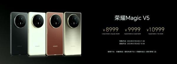 7月2日消息,荣耀今晚发布了折叠机皇荣耀Magic V5,售价8999元起。