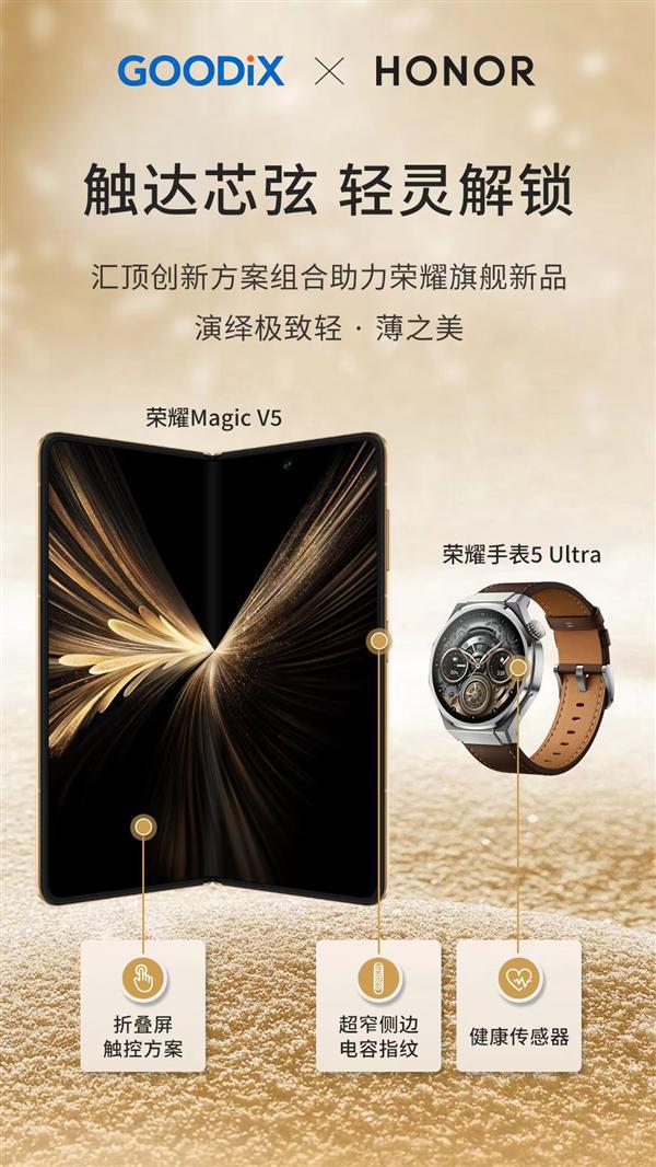 荣耀Magic V5采用汇顶科技折叠屏触控方案及超窄侧边电容指纹方案。