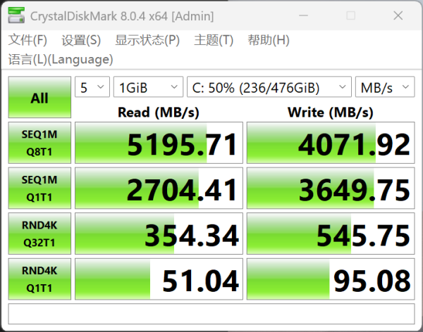 512GB的SSD半盘状态下顺序读取速度5195.71MB/s,顺序写入速度4071.92MB/s,表现还行。