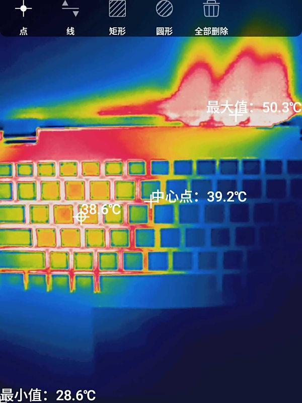 首先来单烤FPU测试,40分钟之后,Dell Pro 14 Plus搭载的AMD锐龙AI 7 Pro 350功耗能够稳定在25W,频率2.6GHz,核心温度69.8℃,整体十分凉爽;此时Dell Pro 14 Plus的B/C面温度最大值为右侧上方出风口处的50.3℃,C面整体十分凉爽,WASD区域温度仅为38.6℃,腕托处温度更低。