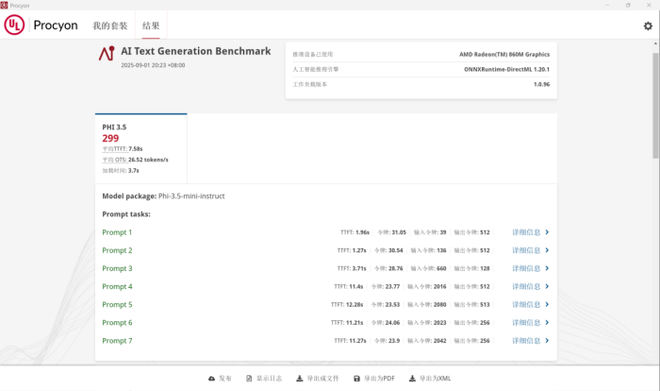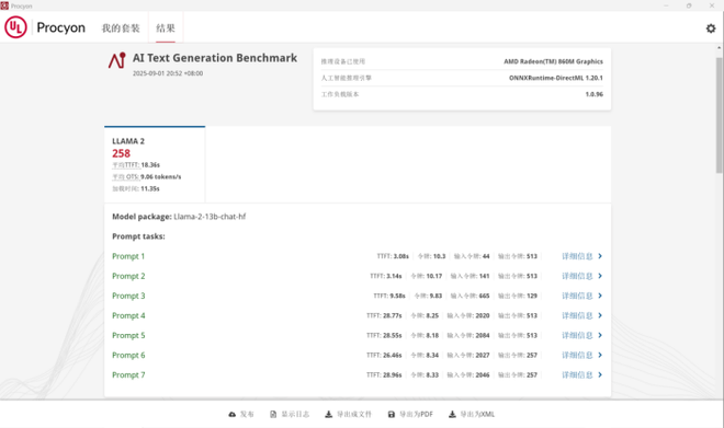 我们先来通过一些测试来看一下锐龙AI 7 Pro 350的AI能力。我们使用UL Procyon软件中的AI文本生成基准进行测试。在面对Phi-3.5-mini模型时它能获得299的得分,平均OTS能达到26.52 tokens/s;而在面对13b规模的LLAMA 2模型时,平均OTS为9.06 tokens/s。
