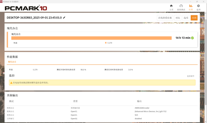 Dell Pro 14 Plus搭载了一块3芯55 Whr电池,支持快速充电,随机配备了一个65W USB Type-C适配器。我们采用PCMark 10现代办公来进行电池续航测试,设定屏幕亮度50%、电源模式最佳能效,开启Wi-Fi。Dell Pro 14 Plus跑出了14小时13分钟的续航时间,平心而论,55Whr的电池容量并不算突出,而Dell Pro 14 Plus的续航成绩却是相当靠谱的,这也为用户在多元场景下的移动办公提供了长久的续航支持。