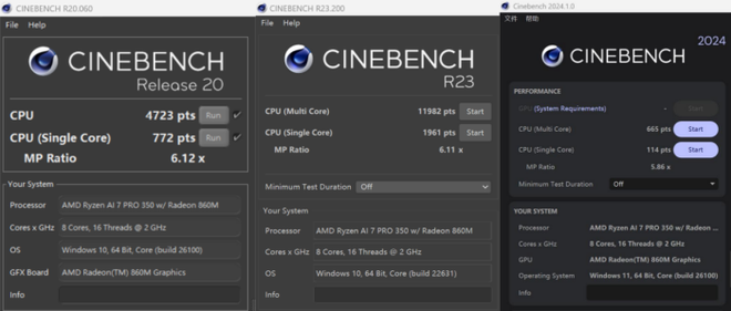 结合CineBench R20、R23以及CineBench 2024的三项多核成绩来看,25W的锐龙AI 7 Pro 350的性能释放还是非常不错的,单核、多核性能很出色。