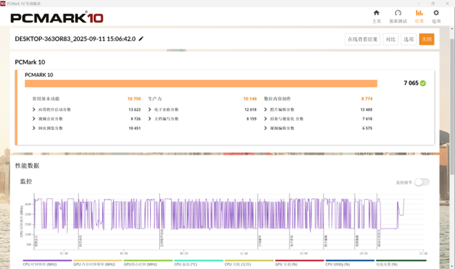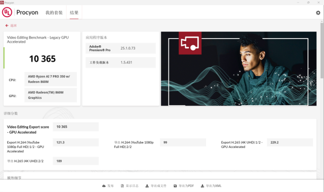 视频编辑测试主要针对Adobe Premiere Pro软件进行。测试内容涵盖将视频项目文件导出为通用格式;各种视频片段的编辑、调整和应用效果,并基于导出视频所需的时间给到测试成绩。我们可以看到,在进行视频编辑测试时调用了GPU加速,在AMD Radeon 860M的帮助下,Dell Pro 14 Plus获得了10365的分数,表现十分出色。