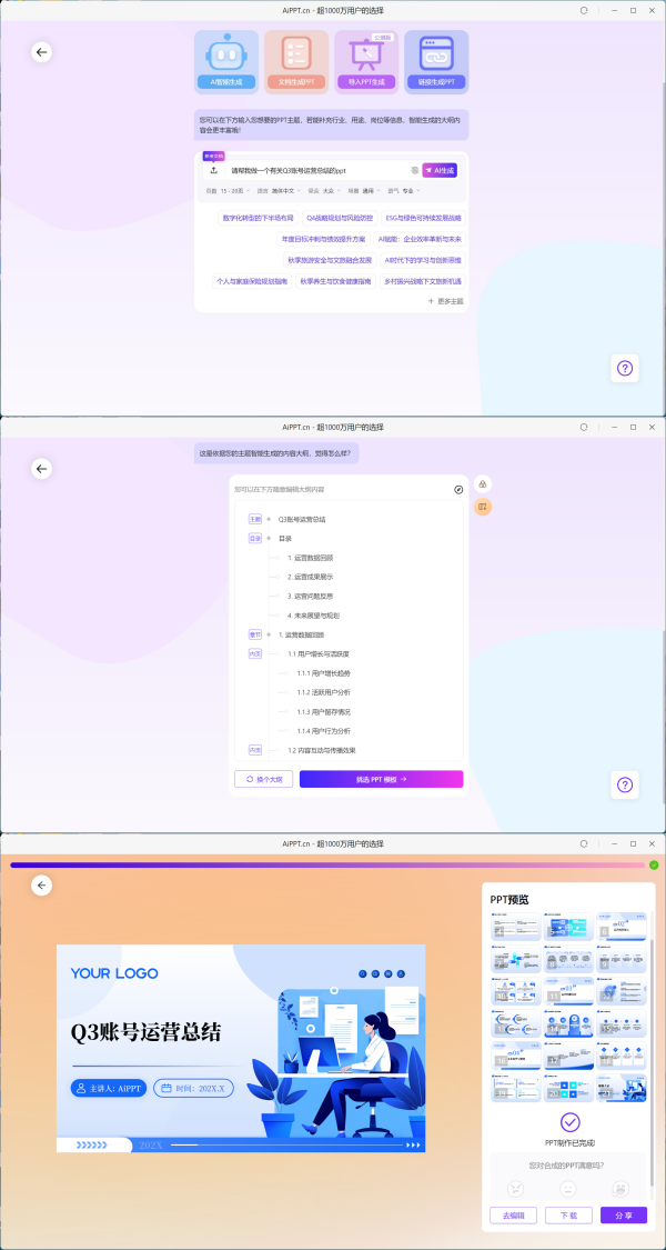 AI PPT能相当程度上减轻相关工作人员的工作压力,我们只需要把需求输入,AI PPT就可以生成详细的PPT大纲、脑图,并为用户提供可选的PPT模板,之后就能生成一个全面的空PPT,用户只需要按照需求将数据、内容等填写进去即可,非常省时。