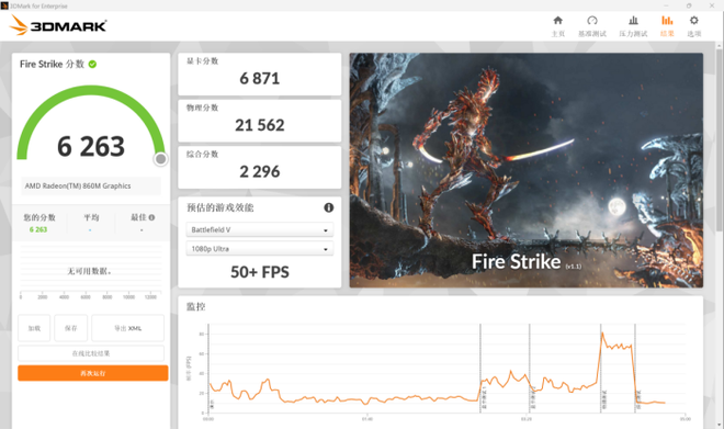 GPU图形性能方面,我们通过3D Mark软件中的Time Spy、Fire Strike以及Night Raid项目进行测试。在前两项较高负载的测试中,Radeon 860M分别能够获得2548和6871的分数,软件认为其在面对《战地5》1080P分辨率负载下能够实现至少50fps以上的游戏表现,对于一款商务本来说还是相当出色的。而在主要面向轻薄本测试的Night Raid项目中,Radeon 860M也能够拿到超过3w+的分数。