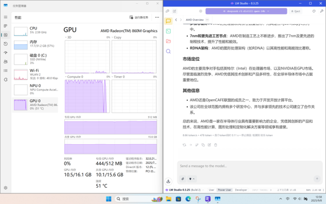 我们还通过LM Studio在本地部署了大小为7b和14b的两个DeepSeek R1模型,通过实际体验能够得知,在本地运行7b模型速度能够达到17.15 tokens/s,平均延迟也比较短,能够获得一个较为流畅的本地AI体验。运行14b模型的负载相对较高,但也能达到8.66 tokens/s,基本上比较流畅。