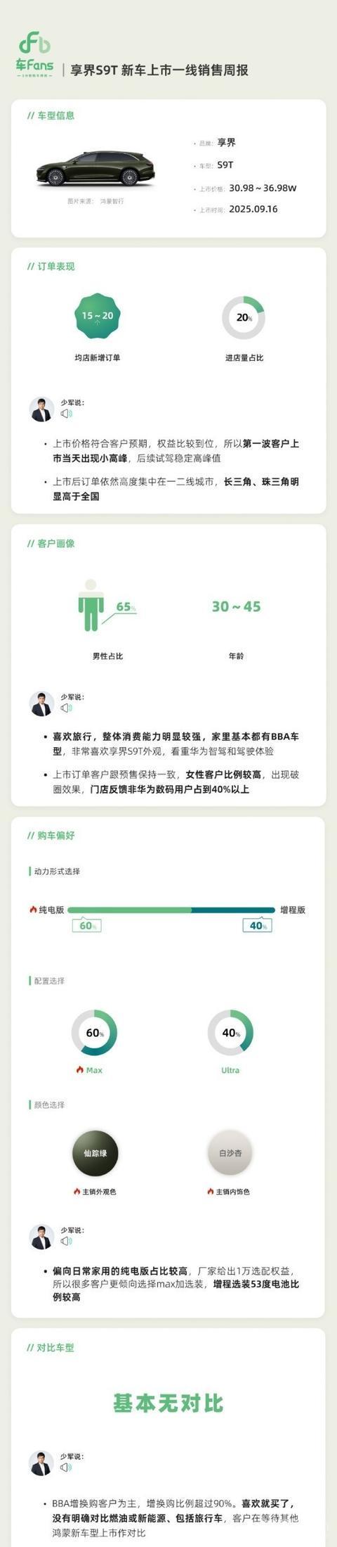 享界S9T一线销售周报,BBA增换购盛行,女性客户占比突出