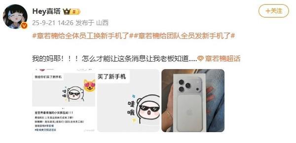 近日,有网友在社交平台爆料称,知名女星章若楠为全体员工更换新手机,引发网友实名羡慕。CNMO从网传图片获悉,章若楠为员工新换的手机正是时下火热的iPhone 17 Pro系列。