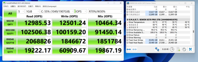 这块旗舰PCIe 5.0固态硬盘以半盘状态在CrystalDiskMark测试中,达到13616.31MB/s的顺序读取速度与13108.50MB/s的顺序写入速度,70%读30%写的混合场景测试也达到10972.66MB/s。