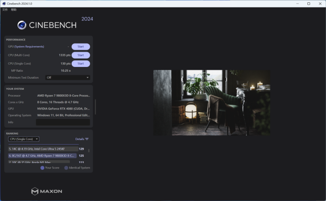 CINEBENCH 2024更换了新引擎与更复杂的测试场景,锐龙 7 9800X3D搭配战斧B850M超级黑刃主板获得多核分数1335分,单核分数130分。