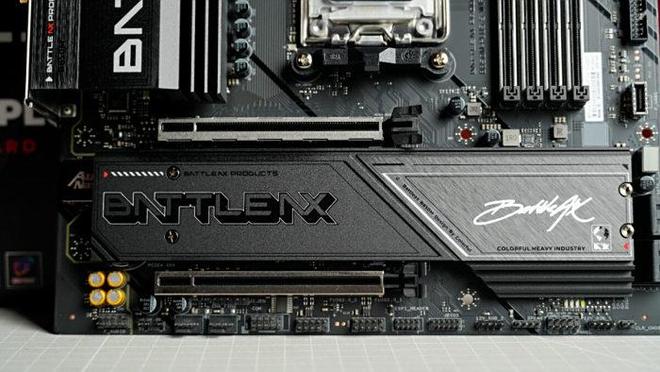 主板下部可见两条使用合金加固的PCIe插槽,其中上部为显卡使用的PCIe 5.0x16高速插槽,下部的PCIe 4.0x4插槽同样为全长,可供万兆网卡等更多类型的PCIe设备扩展使用。两条PCIe插槽之间使用一体式的合金散热装甲覆盖双高速NVMe M.2固态硬盘位,装甲表面依然使用磨砂、拉丝两类不同表面工艺,使用斜线分割,并在两侧分别印有不同风格的“BATTLE-AX”装饰字样。