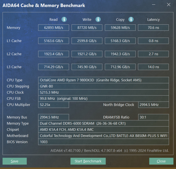 在AIDA64-内存与缓存测试中,这套内存测得内存读取:62893MB/s、内存写入: 87720MB/s、内存复制:59628MB/s、延迟为70.6ns。