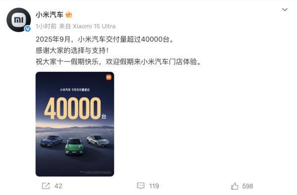 小米汽车交付量突破新纪录,预计至2025年9月交付量达四万台