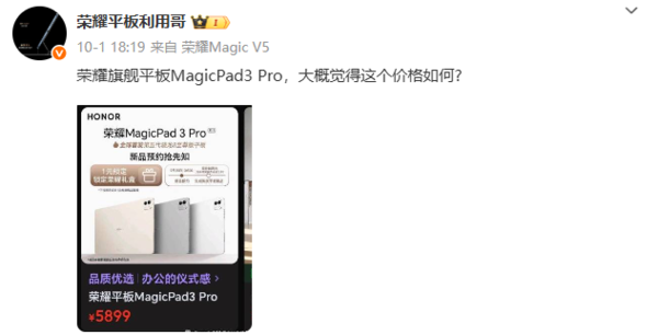 此外,荣耀平板与IOT产品领域总经理“荣耀平板利用哥”此前曾在社交平台发文,就荣耀旗舰平板MagicPad3 Pro的价格与网友互动,配图显示价格为5899元。