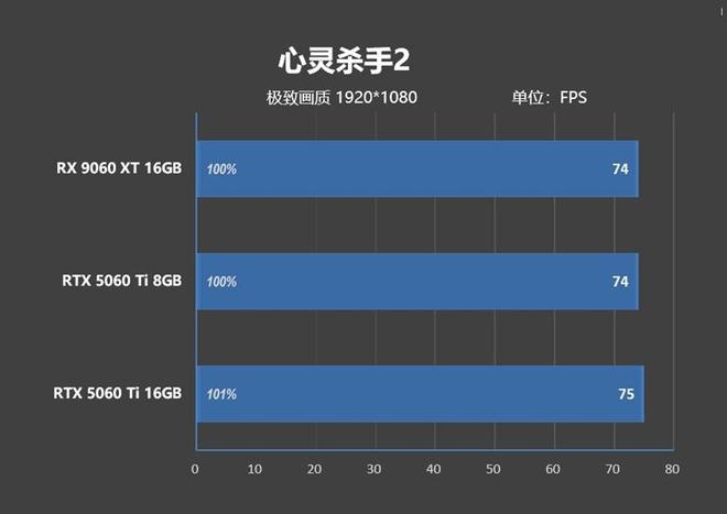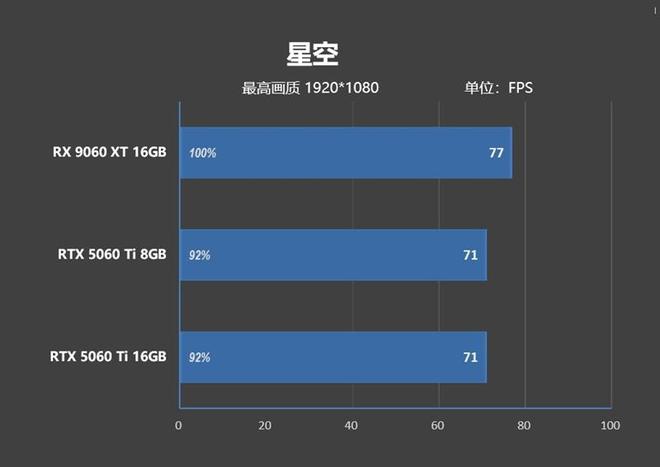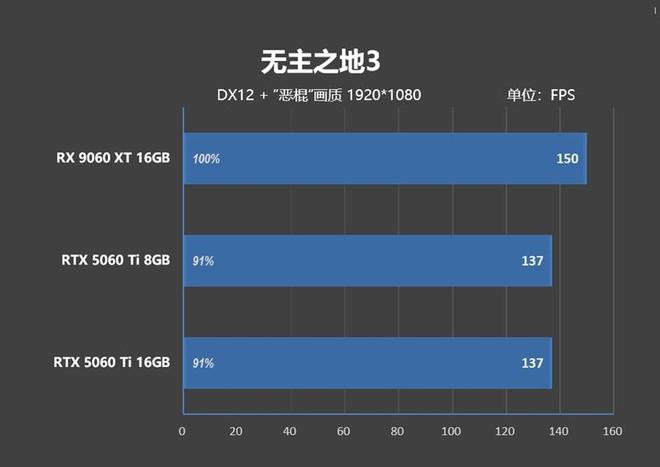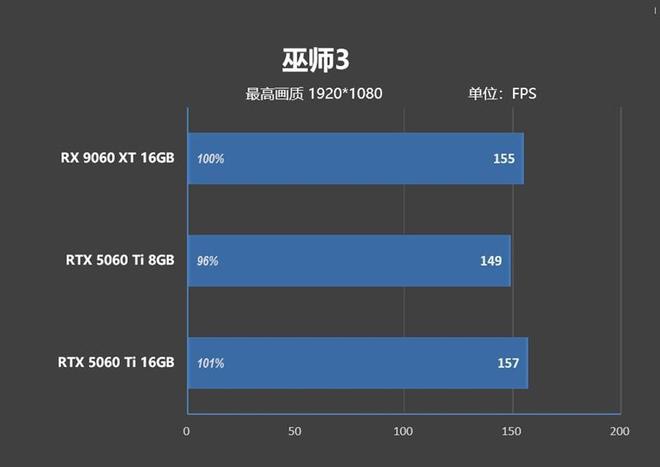 1080P分辨率下,RX 9060 XT 16GB比RTX 5060 Ti略微强一点,对比RTX 5060 Ti 16GB,仅有3%的差距。