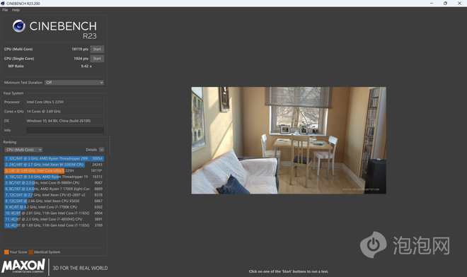 在Cinebench R23当中,酷睿Ultra 5 225H处理器多核成绩24159pxs,单核成绩 2565pxs,跑分成绩与当下主流轻薄本的成绩相差无几,性能表现出色。