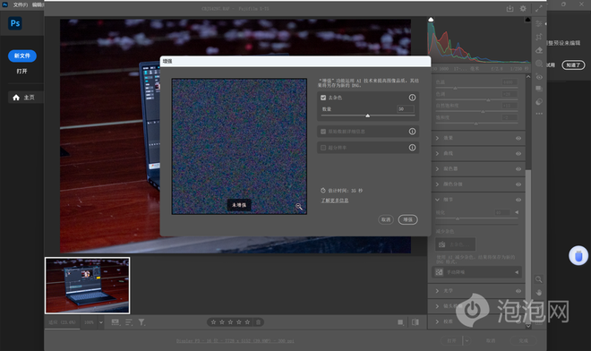 不过,除了现场快速导出视频之外,很多时候摄影师也需要快速出图,但尽管大部分片场灯光还是非常不错的,但还是有一些场景昏暗的地方,让摄影师发现无论怎么设置都有着令人烦人的噪点,这个时候我们就需要借助很多软件当中的AI降噪功能了,这对于本地算力的要求还是十分明显的。我们就使用Photoshop 2025中Camera Raw里面的去杂色功能,对一张大小约为80MB的RAW图像进行了处理。
