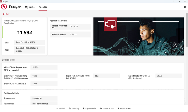 首先我们用UL Procyon的测试模拟看看,ThinkBook 14+ 2025酷睿版在日常的图片和视频处理当中有着怎样的表现。首先来看看UL Procyon视频剪辑测试,ThinkBook 14+ 2025酷睿版在开启GPU加速后,在基于Adobe Premiere Pro的视频编辑场景中得分为11592分,视频剪辑能力非常强劲。