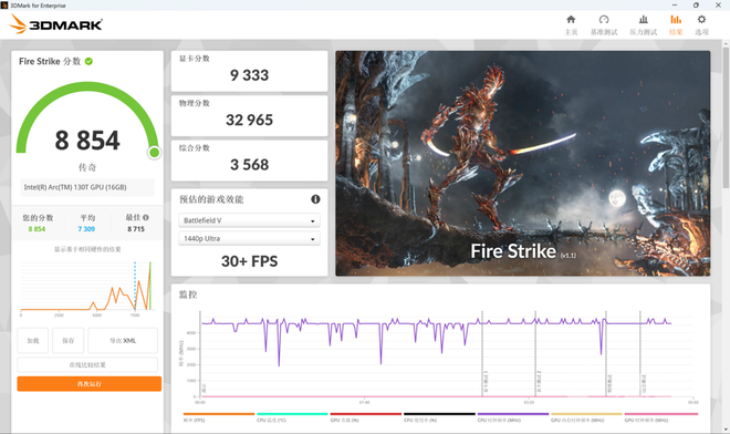 看完CPU,我们再来看看核显的表现如何。酷睿Ultra 5 225H内置了Intel Arc 130T核显,拥有7个Xe核心。在3DMark跑分测试中,Intel Arc 130T表现出色,Time Spy显卡分为3871分,Fire Srike显卡分为9333分,在采用相同核显的产品测试当中表现居前,充分展现出了联想针对ThinkBook 14+ 2025酷睿版也进行了出色的优化,让整体的性能表现更进一步。