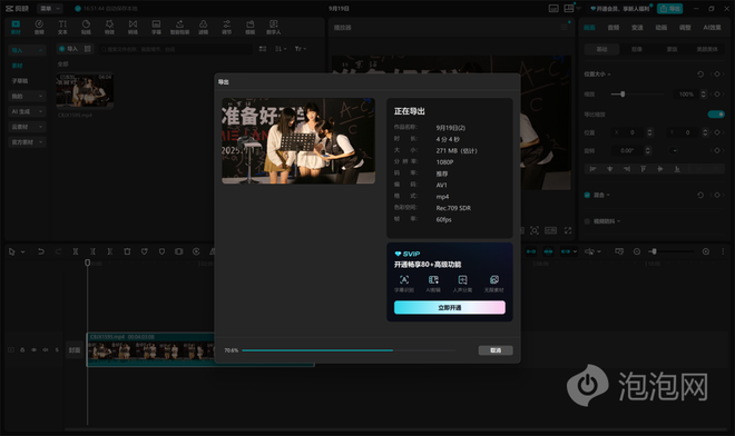 但是在实际的后期当中是否也有这样的表现呢?我们来一起看看实际使用时的表现。对于活动剪辑师而言,导出速度就是生命线。我们使用剪映,将一段在真实活动现场拍摄的,原素材大小约5.5GB的4K 60FPS H.264素材进行剪辑、调色后,分别导出为FHD 60FPS规格下的H.264(AVC)、H.265(HEVC)以及H.266(AV1)三种编码格式,来看看ThinkBook 14+ 2025酷睿版在实际出片时的速度表现如何。