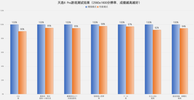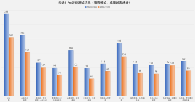 到了玩家最关注的游戏表现,《CS2》、《永劫无间》、《黑神话:悟空》、《赛博朋克2077》、《古墓丽影:暗影》、《全面战争:三国》、《怪物猎人:荒野》、《F1 24》、《极限竞速:地平线5》、《无主之地3》、《孤岛惊魂:新曙光》、《地平线:零之曙光》等覆盖电竞网游、3A游戏在内的12款游戏,分别在1920x1200和2560x1600两档分辨率下进行测试,并将天选6 Pro的系统设定为增强模式,结果如下。