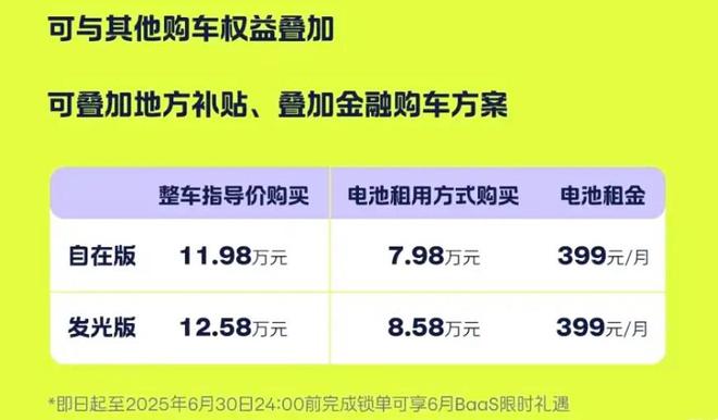 值得一提的是,蔚来萤火虫还为首任车主提供了6月限时付4赠1的活动,而满足条件的前提则是仅需在即日起至2025年6月30日24:00前完成锁单,便可享6月BaaS限时礼遇。